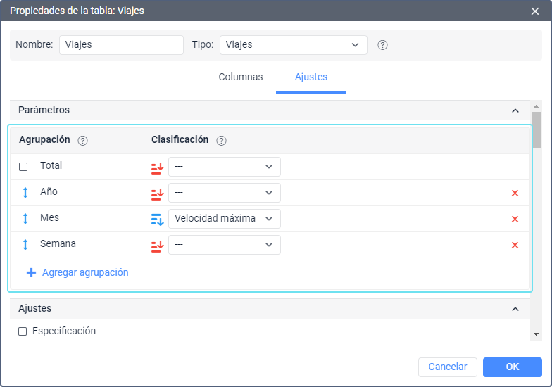 Según el tipo del informe, además de las agrupaciones estándares (por intervalos temporales) pueden estar disponibles agrupaciones adicionales (por ejemplo, por geocerca, ruta, sensor, usuario, evento, tipo de acción, tipo de infracción, viajes, calles). En tal caso la agrupación funciona “por el nombre” del elemento.