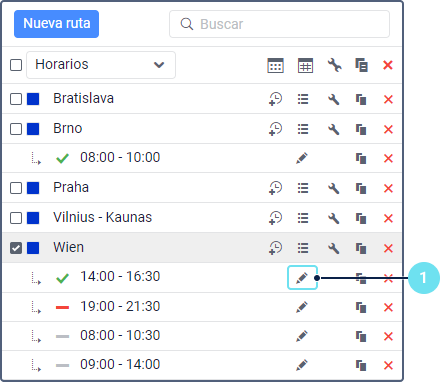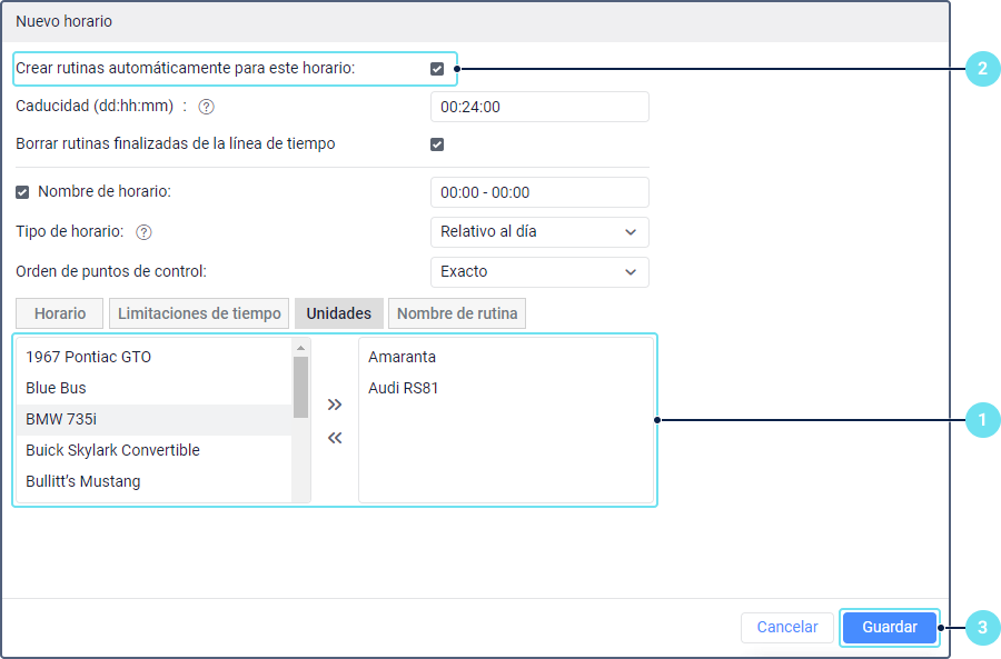 Más tarde puede activar y desactivar la creación automática de rutinas usando el icono / al lado del nombre del horario. Las rutinas se crean automáticamente cuando antes de la hora de llegada planificada al primer punto de control quedan tantos minutos cuantos están indicados en el campo de desviación. Si varias unidades están indicadas, se asigna la que es la primera en abandonar la geocerca del punto inicial de la ruta sin importar el orden de puntos seleccionado. |