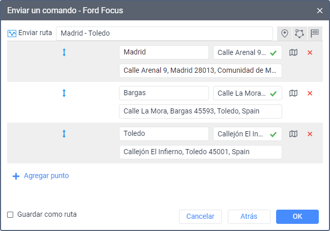 Se puede guardar los puntos indicados como una ruta para utilizarla después en la pestaña Rutas del sistema de seguimiento. Para hacerlo, active la opción Guardar como ruta.