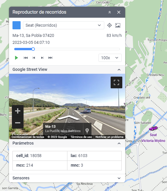 Durante la reproducción, bajo el nombre de la unidad, se muestran la dirección y velocidad de cada mensaje; y encima de la escala temporal, la fecha y hora. Además, si hay claves de Google o Yandex, se puede seguir el movimiento de las unidades usando las vistas panorámicas de calles. Para eso hay que desplegar las secciones Google Street View o Yandex Panorama situadas abajo.