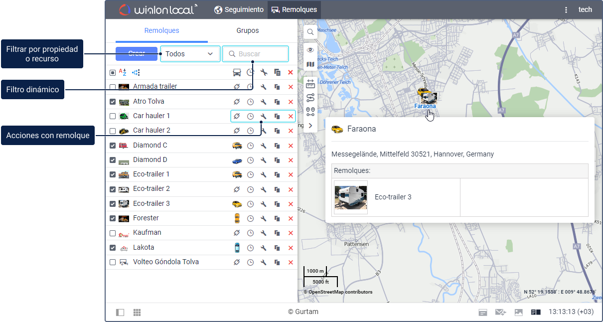 Para que un remolque se muestre en el mapa, márquelo en la lista. Previamente, asegúrese de que la capa de remolques está activada.