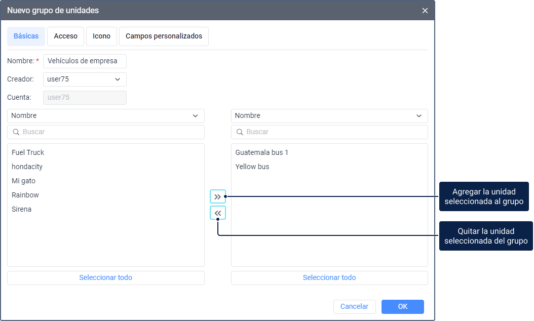 En la lista izquierda se muestran todas las unidades disponibles, en la lista derecha, las que ya se han agregado al grupo.