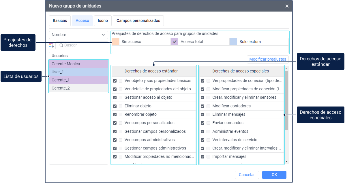 En la pestaña se puede conceder a los usuarios los derechos de acceso al grupo. Los derechos también se aplican a todas las unidades agregadas al grupo.