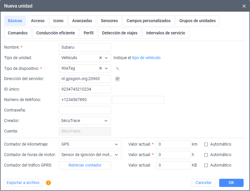 La ventana de propiedades de unidad se muestra al crear, modificar y copiar una unidad. En la ventana, puede indicar diferentes parámetros de la unidad, configurar acceso a la misma, crear sensores, etc.