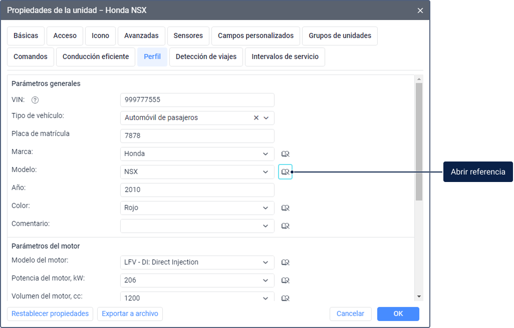 En esta pestaña se puede indicar la información técnica y de registro sobre el vehículo. Según las opciones activadas en los parámetros del usuario, estas características pueden mostrarse en la lista de trabajo y/o en la descripción emergente de la unidad. Se puede ver las características en el informe del mismo nombre (o agregarlas a otros informes como columnas personalizadas) y, al igual que otras propiedades de unidad, importar y exportarlas.