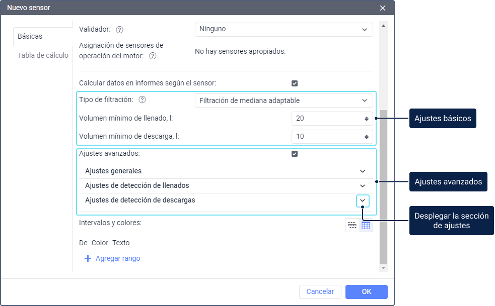 El sensor del nivel de combustible tiene ajustes adicionales que se muestran cuando se activa la opción Calcular datos en informes según el sensor y se dividen en básicos y avanzados.