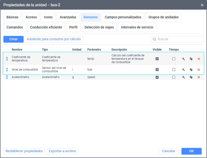 Cualquier líquido puede comprimirse o expandirse a diferentes temperaturas, por eso las lecturas del sensor del nivel de combustible pueden no ser lo suficientemente precisas sin tomar en cuenta la temperatura en el tanque de combustible o, por ejemplo, en la cisterna. En este caso, para obtener cálculos más precisos del nivel de combustible, también hay que crear un sensor del tipo Coeficiente de temperatura. Este sensor permite calcular el coeficiente de temperatura a base del parámetro en el que se envían los datos de temperatura o voltaje.