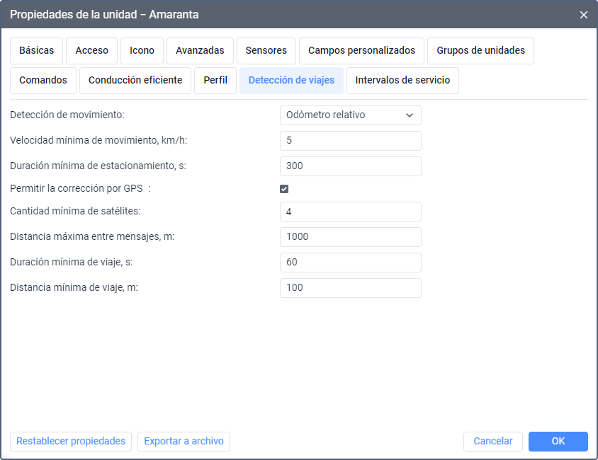 Los parámetros de detección de viajes se utilizan para determinar intervalos de movimiento, viajes, paradas y estacionamientos.