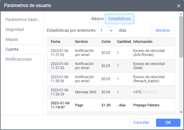 En la sección Estadísticas, puede conocer cuánto se ha cobrado por el uso de los servicios. Están disponibles los datos de los últimos 60 días. Para ver la estadística, seleccione el intervalo de tiempo necesario y apriete el botón Mostrar.