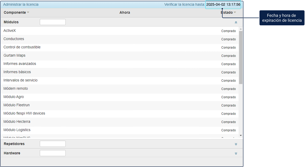 En el rincón superior derecho del bloque se puede ver la fecha y hora en que finaliza el plazo de validez de la licencia. Si quedan menos de 12 horas hasta que expire este plazo, al lado de la fecha aparece un indicador de color amarillo. Si la licencia ya ha expirado, un indicador de color rojo. También el indicador de color rojo significa que no hay conexión a Internet que es necesaria para mantener la conexión con el servidor de licencias y una operación correcta de Wialon Local.