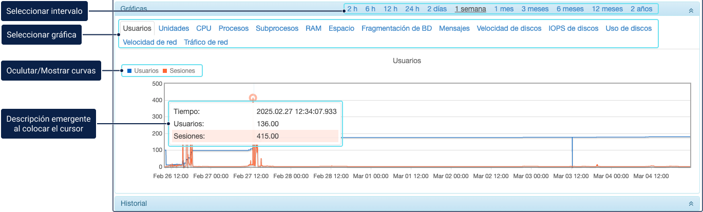 En el bloque Gráficas se muestra información visual de varios indicadores. El intervalo temporal para las gráficas se escoge en la parte derecha superior del bloque con las mismas.