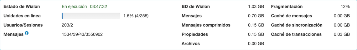 | Mensajes comprimidos | Es el tamaño sumario de los mensajes comprimidos en la base de datos de Wialon. |