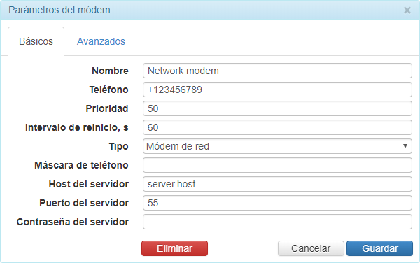 | Intervalo de reinicio, seg. | Indique el intervalo de reinicio en segundos. Si ha sido interrumpida por alguna causa la conexión con el módem, este será reiniciado automáticamente al pasar el tiempo indicado. Note que si el intervalo de reinicio es 0, el módem no será iniciado al reiniciarse el servicio. |