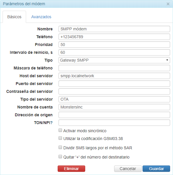| Activar modo sincrónico | El modo sincrónico SMPP puede ser útil para diagnosticar dispositivos. Esto funciona por el siguiente algoritmo: hasta que no haya notificación de entrega del primer mensaje, el segundo no será enviado. |