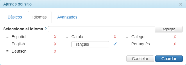 Para agregar un idioma, selecciónelo en la lista desplegable y apriete el botón Agregar. Repita para otros idiomas si es necesario.