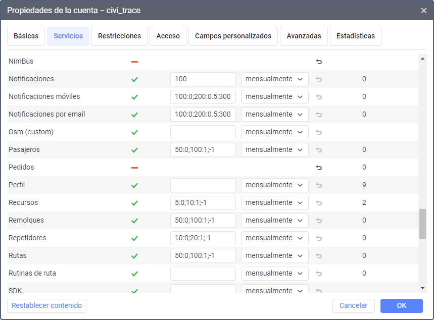 En esta pestaña se enumeran todos los servicios disponibles para la cuenta. El conjunto de servicios depende del plan de facturación asignado a la cuenta. Aquí puede activar y desactivar servicios para la cuenta, establecer sus cantidades y costes.