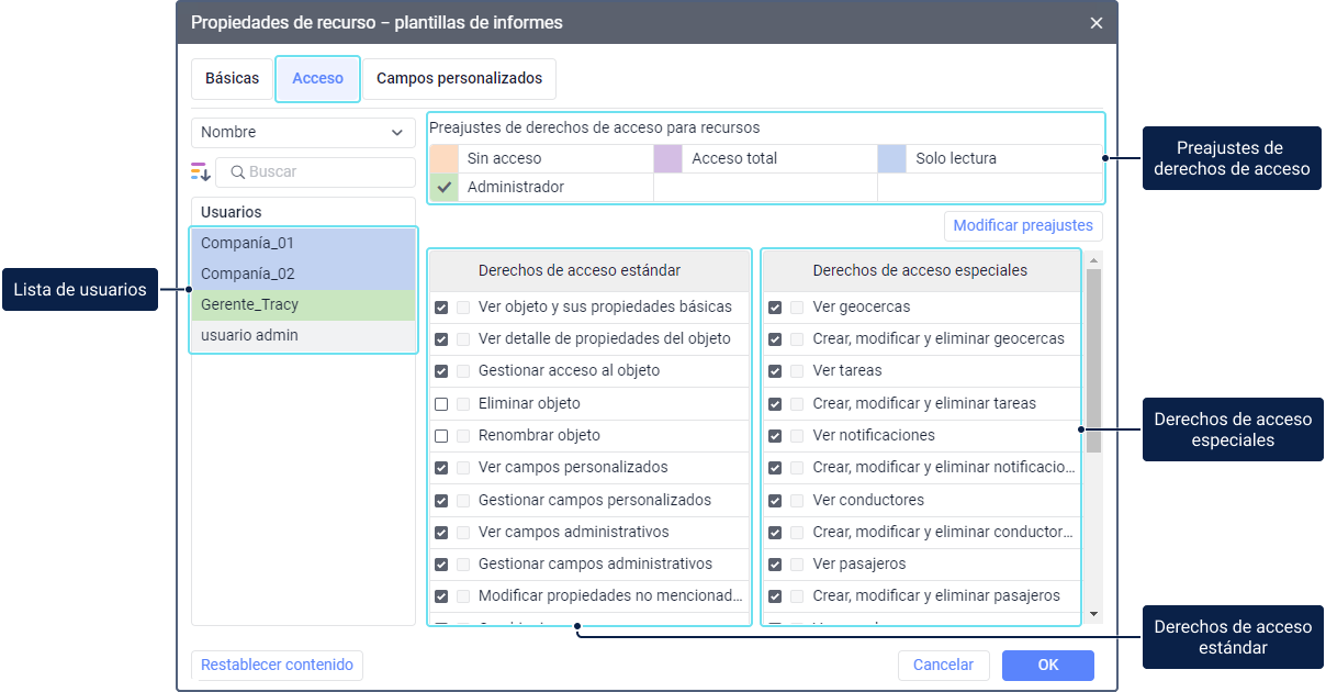 En la parte derecha se muestran los derechos de acceso al recurso que pueden ser concedidos al usuario. Los derechos están divididos en dos tipos: estándar y especiales.