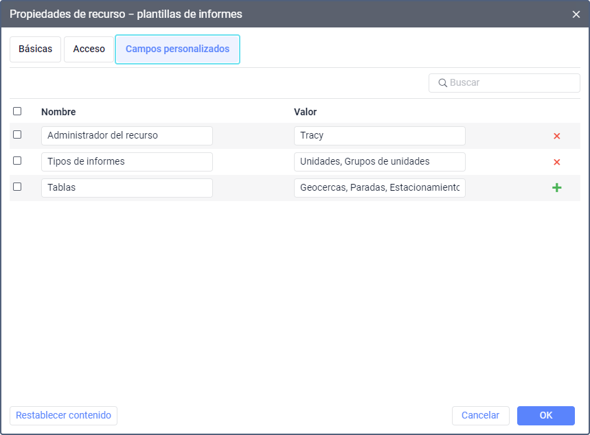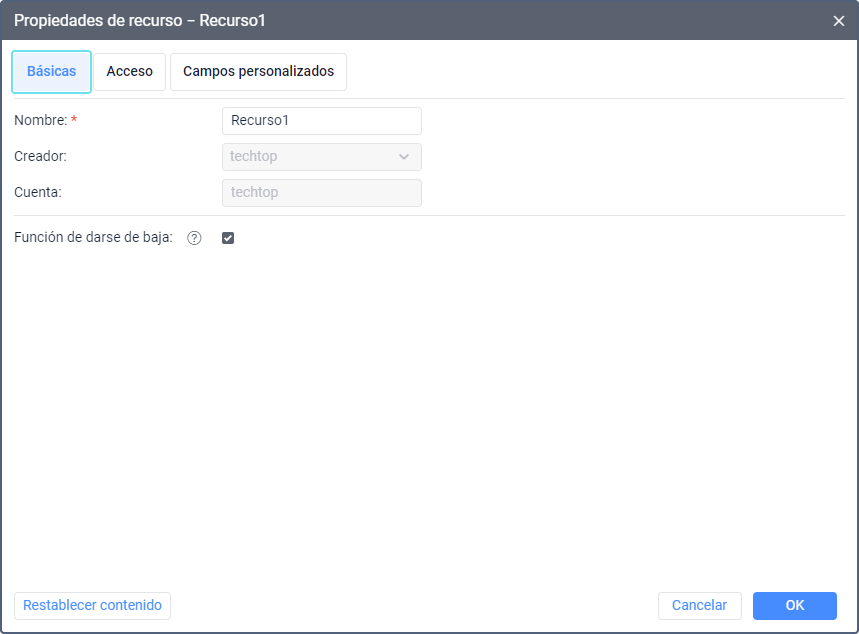 | Creador | Es el usuario en nombre del cual está creado el recurso. No puede cambiar el creador del recurso. |