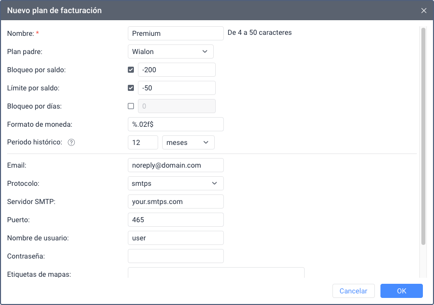 | Etiquetas de mapas | En este campo, puede indicar las etiquetas de los mapas que deben ser disponibles en este plan de facturación. Las etiquetas se separan por una coma. Si el campo no está llenado, serán disponibles todos los mapas que están activados por defecto. La formula de introducir etiquetas: