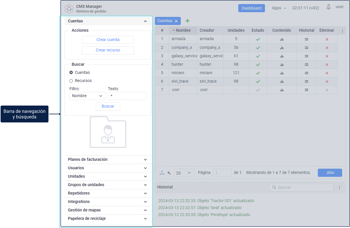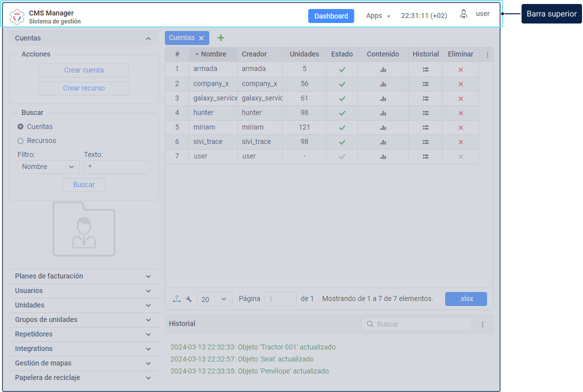 La interfaz del sistema tiene los siguientes componentes básicos: