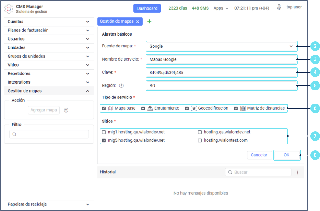 | Clave* | Clave API adquirida para conectar la fuente de mapa necesaria. Para algunos mapas, existen claves API gratuitas. En este caso, tiene que obtener esta clave en el sitio web del proveedor correspondiente. Es obligatorio rellenar el campo Clave si utiliza las siguientes fuentes de mapas: AMap, Google, HERE, Kosmosnimki, Mapbox, MyIndia, Namaa, OpenWeatherMap, Sygic, Trimble, Visicom, What3words, Regional. Si escoge la fuente de mapa Custom map, el campo Clave está disponible, pero no es obligatorio. |