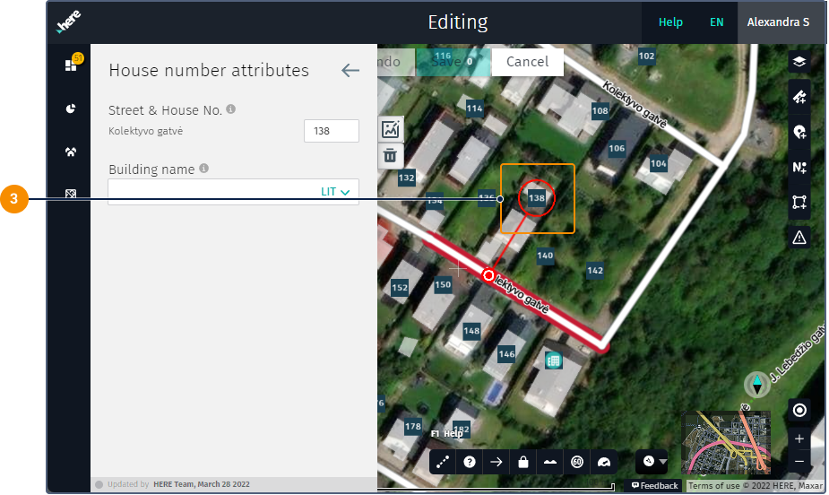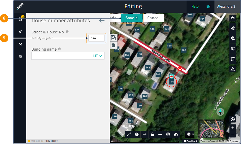 - Asegúrese de que la casa está relacionada con la calle correcta. Si no es así, puede arrastrar manualmente el punto de conexión a la calle correcta. Si la calle que necesita no tiene nombre o no existe, tendrá que añadirla al mapa.