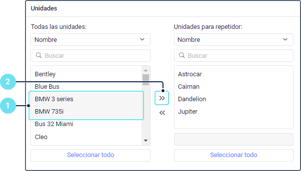 En esta sección hay que seleccionar las unidades cuyos datos deben transmitirse. Para hacerlo, escoja las unidades necesarias en la sección Todas las unidades muévalas a la lista Unidades para repetidor apretando el icono