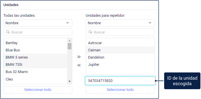 . Para escoger todas las unidades a la vez, apriete Seleccionar todo. Para elegir todas o varias unidades a la vez, se puede usar combinaciones de teclas especiales. Para agregar una unidad a la lista del repetidor, es suficiente hacer clic en su nombre dos veces.