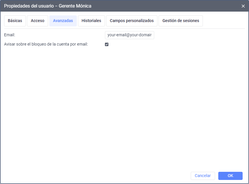 En la pestaña Avanzadas puede indicar el correo electrónico al que el usuario debe recibir los mensajes del administrador del servicio.
