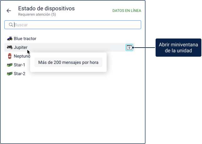 Para encontrar unidades por nombre, utilice la búsqueda dinámica encima de la lista. Haga clic en la línea con la unidad para abrir su miniventana.