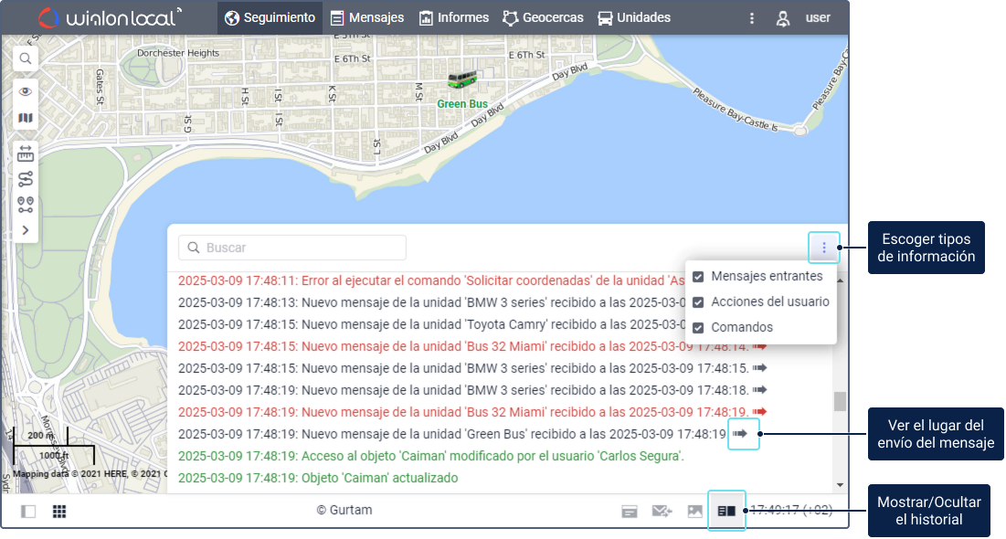 El historial muestra información en tiempo real sobre la recepción de mensajes de unidades, comandos enviados y ejecutados, así como sobre las acciones del usuario.