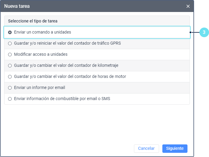 Configure los parámetros que dependen del tipo de tarea escogido y se describen en el capítulo Tipos de tareas. Para el tipo Enviar un comando a unidades, este paso se realiza después de la selección de unidades.