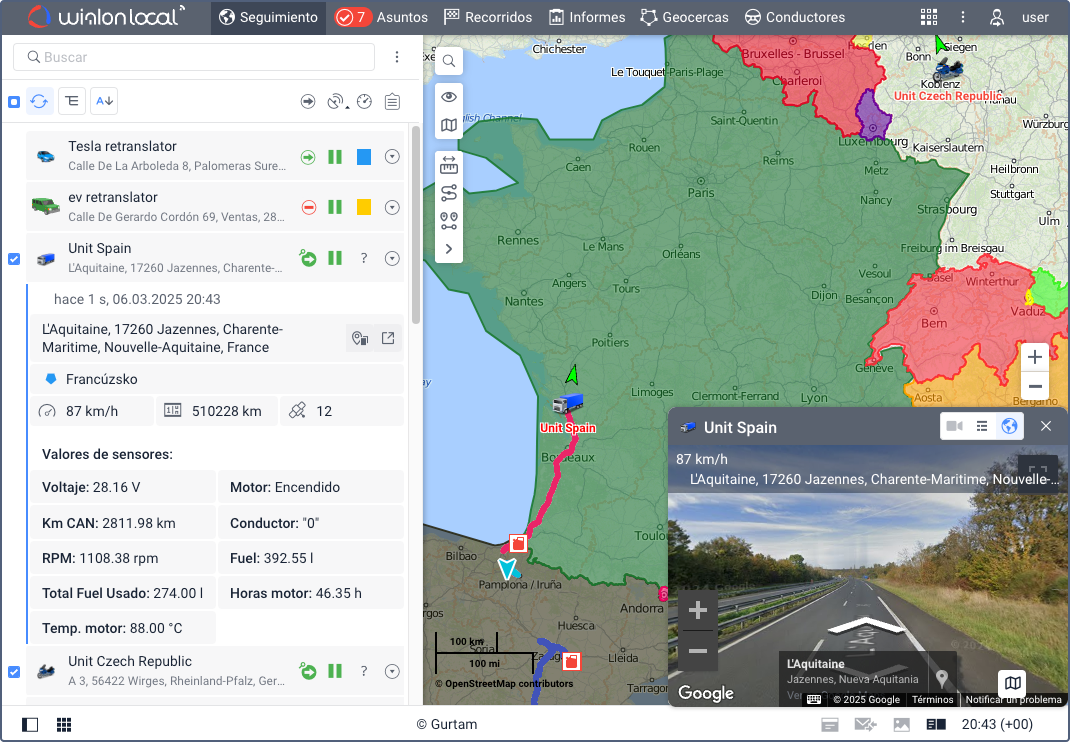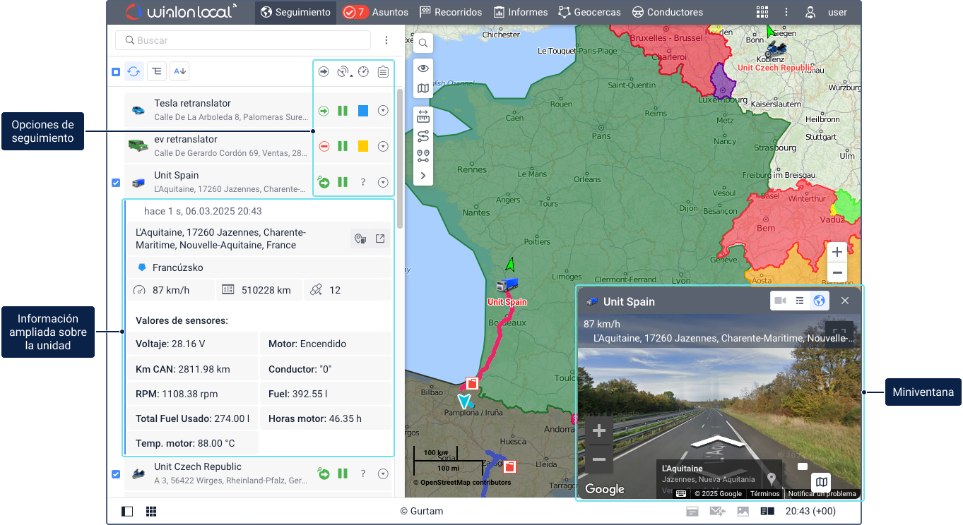 En la pestaña Seguimiento, puede ver la lista de trabajo de unidades y el mapa en el que puede rastrear su movimiento en tiempo real. Aquí se encuentran las funciones principales relacionadas con el seguimiento de unidades y sus parámetros.