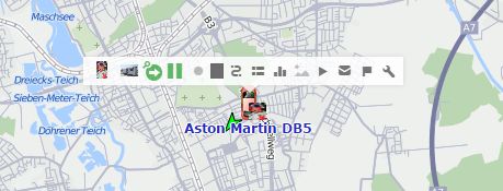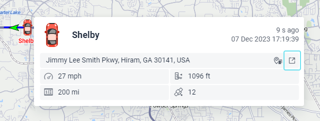 Una vez hecho clic en una unidad en el mapa, se abre un menú encima de la unidad. Contiene las mismas opciones que se han elegido para el área de trabajo de la pestaña Seguimiento. Además, independientemente de las opciones elegidas, en este menú siempre hay iconos para generar un informe rápido y para construir un recorrido rápido.