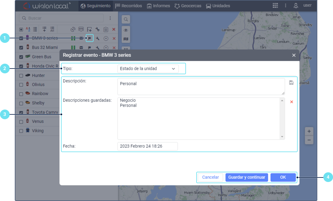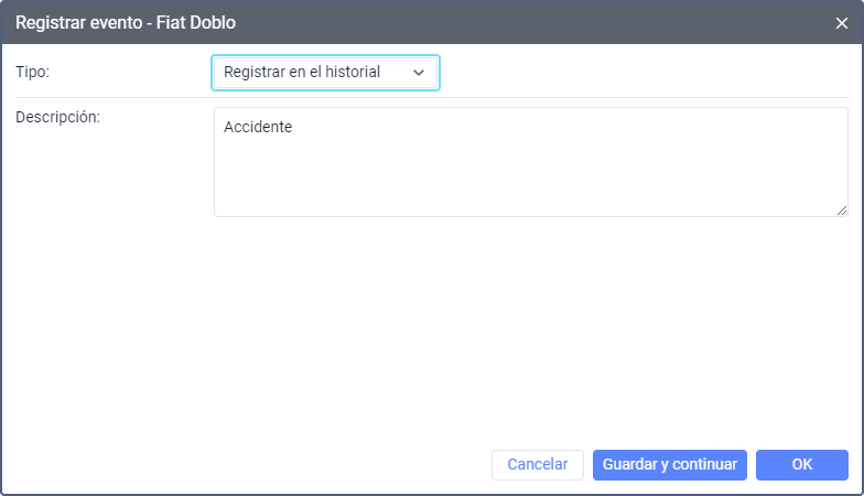 al lado de la unidad deseada. Si no hay este ícono, active la opción Registro de eventos en los ajustes de las opciones de seguimiento. - Seleccione el tipo: un registro en el historial de la unidad o uno de los eventos disponibles.