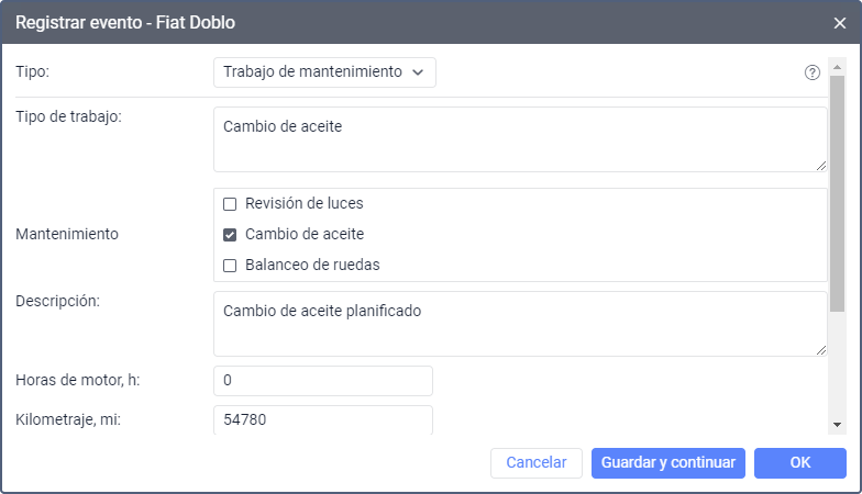 | Mantenimiento | Lista de servicios generada a partir de los intervalos de servicio creados en las propiedades de la unidad. Seleccione los servicios que se han realizado para que se inserten automáticamente en el campo Tipo de trabajo. Se restablecerán los intervalos de servicio correspondientes en las propiedades de la unidad y se reiniciará la cuenta atrás de días, horas motor y/o kilómetros hasta el próximo servicio. |