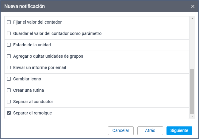 Este modo de acción permite separar automáticamente el remolque de la unidad. Si se asignan varios remolques a una unidad, todos ellos se separan tras activarse la notificación. Los remolques y la notificación se deben guardar en el mismo recurso.