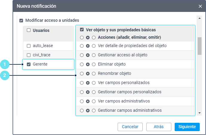| Utilizar unidad en tareas, notificaciones, rutas, repetidores | El usuario que configura la notificación y el usuario creador del recurso en el que se guarda la notificación deben tener este derecho de acceso a todas las unidades seleccionadas. | |
