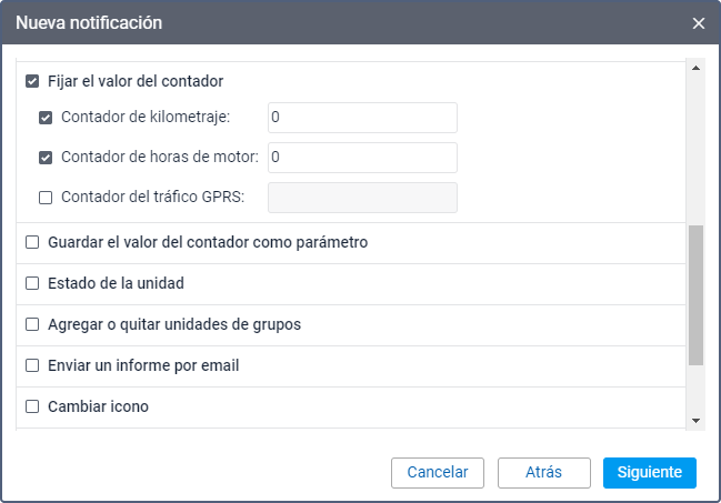 Para configurar este modo de acción, marque los contadores necesarios y al lado indique qué valores deben tener estos contadores después de que se active la notificación.