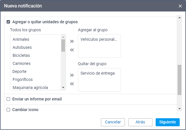 Este modo de acción permite agregar o quitar la unidad escogida de grupos determinados. Para que la unidad se agregue a un grupo después de que se active la notificación, haga clic en el grupo necesario en la lista Todos los grupos y muévalo a la lista Agregar al grupo utilizando el icono