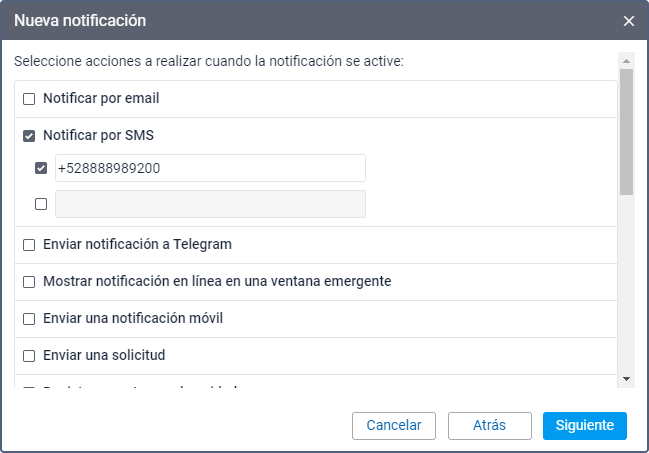 Este modo de acción permite configurar el envío de notificaciones como mensajes de texto SMS. Para hacerlo, realice los siguientes pasos: