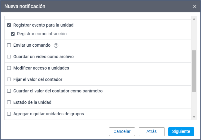Si es necesario, active la opción Usar unidad activada. Está disponible solo para plantillas de informes por unidades o grupos de unidades. Si la opción está activada, el informe se ejecuta solo para aquella unidad que hace activarse la notificación, sin importar qué objeto se ha escogido en la lista anterior.