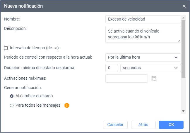 Generar notificación* | El parámetro que permite elegir cuándo debe activarse la notificación. Están disponibled dos opciones: Para todos los mensajes y Al cambiar el estado. El sistema sigue el cambio de estado comparando cada mensaje de la unidad con el anterior. Si el último mensaje recibido contiene un valor de parámetro que cumple las condiciones para activar la notificación y el mensaje anterior contiene uno que no las cumple, la notificación se activará. En el caso de las notificaciones del tipo Valor del sensor y Parámetro en un mensaje, si el mensaje anterior no contiene el parámetro necesario o su valor no es válido, el sistema analiza los 5 mensajes recibidos antes del último. Si entre ellos hay un mensaje con un valor válido, se utiliza en lugar del anterior.