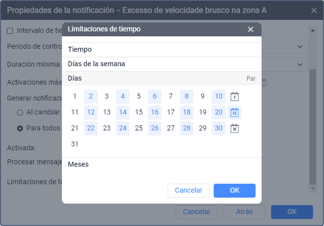 Limitaciones de tiempo | Opción que permite indicar las horas y escoger los días y/o meses durante los cuales deben controlarse los parámetros de la notificación. Por ejemplo, los parámetros pueden controlarse solo los días laborales durante las horas de trabajo o solo los días impares, etc. Lea cómo establecer limitaciones de tiempo a continuación. Si el estado de alarma comienza el día o en el intervalo indicado y su duración máxima se excede, la notificación llega incluso si el estado de alarma acaba en el momento en que los parámetros de la notificación no deben controlarse. |