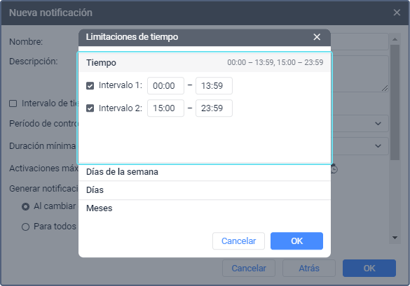 Si ha indicado limitaciones solo en la sección Hora, los parámetros de la notificación se controlan cada día durante los intervalos indicados. Si además de las horas ha indicado días y meses, el sistema controla los parámetros de la notificación solo durante estos días y meses. Si ha indicado limitaciones solo en la sección Meses, los parámetros de la notificación se siguen todo el tiempo durante los meses seleccionados.