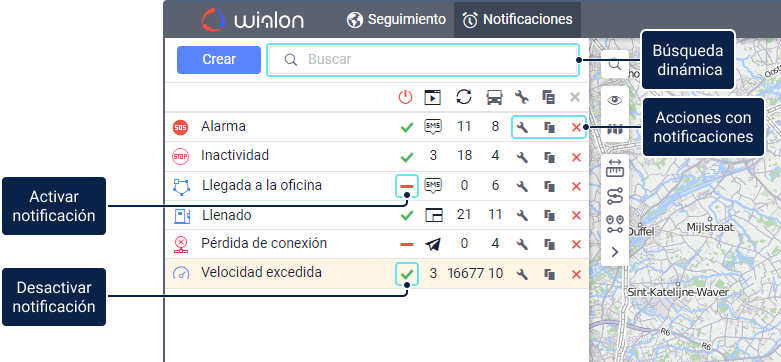 La pestaña contiene una lista de todas las notificaciones disponibles. Encima de la lista, se encuentran un botón para crear notificaciones y búsqueda dinámica por varios criterios.