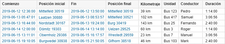 | Ubicación final | La ubicación del pasajero en el momento de separarse de la unidad. Si la separación ha sido automática y en los parámetros de la tabla está elegido Mostrar y marcar como incompleto en función de acción para intervalos incompletos, en el campo se muestra una raya. |