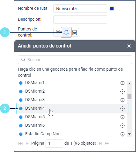Para centrar el mapa en la geocerca, haga clic en el icono en la línea de esta geocerca. La geocerca se muestra solo si ella está marcada en la pestaña Geocercas. Las copias de geocercas seleccionadas se emplean como puntos de control. Por lo tanto, si modifica originales de estas geocercas, esto no afecta a la ruta creada. |