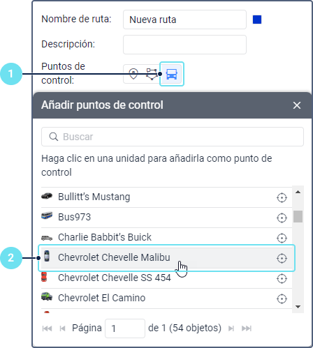 | Añadir puntos de control de unidades | Puede emplear una unidad en marcha como punto de control. En este caso, el punto no tiene coordenadas determinadas y se considera que la unidad llega a este punto cuando se aproxime a la unidad a una distancia del radio especificado. Para añadir puntos de control que son unidades, realice los siguientes pasos: