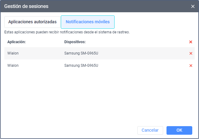 En la ventana Gestión de sesiones se muestra la lista de aplicaciones que tienen acceso a su cuenta y la lista de dispositivos que pueden recibir las notificaciones móviles desde Wialon. Estas listas se generan automáticamente al iniciar sesión en una aplicación.